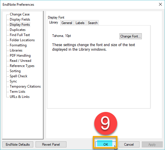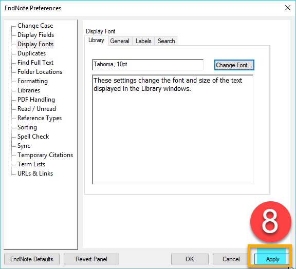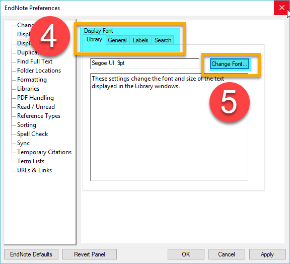 STEP 4: คลิกเลือก Tab ที่ต้องการเปลี่ยนแปลงรูปแบบตัวอักษร ผู้เขียนขอแนะนำว่าให้เปลี่ยนทั้ง 4 ส่วนไปเลยค่ะ ( Tab: Library, Gerneral, Labels และ Search) โดยทำการเปลี่ยนทีละ Tab นะคะ ในที่นี้ขอเปลี่ยน Tab Library ให้ดูเป็นตัวอย่างค่ะ