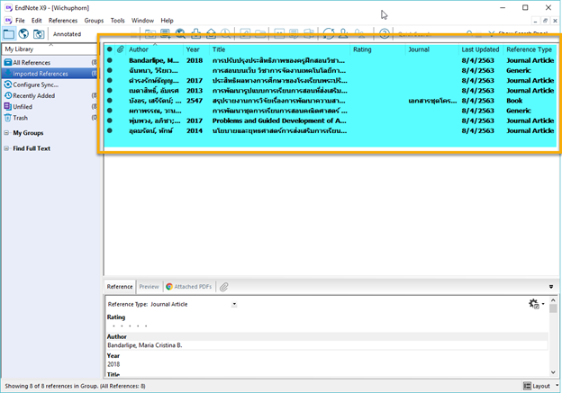 2. ส่วนแสดงรายละเอียดของข้อมูลตามเขตข้อมูลที่ตั้งค่าไว้ เช่น Author (ผู้แต่ง) Year (ปีที่พิมพ์) Title (ชื่อเรื่อง) Reference Type (ประเภทเอกสาร) เป็นต้น