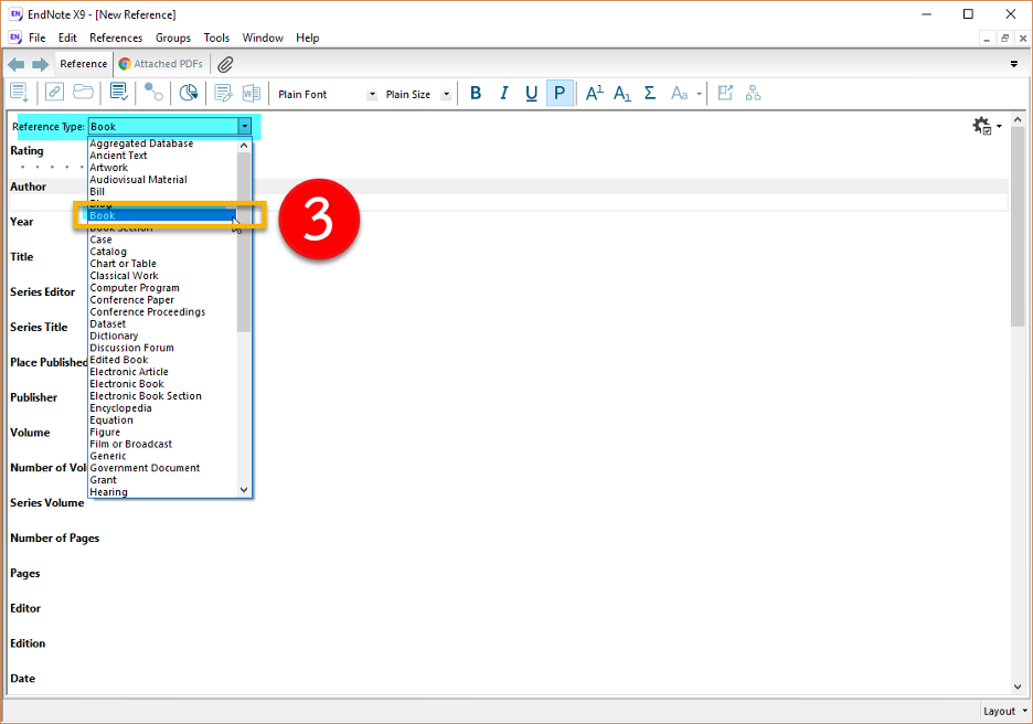 STEP 3: เลือก Reference Type หรือประเภทของเอกสารอ้างอิงที่เราจะนำเข้าสู่ EndNote Library เช่น Journal Article, Book, Thesis เป็นต้น