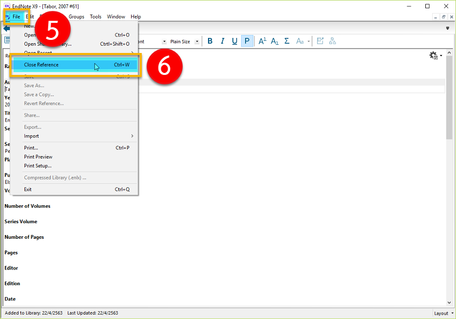 STEP 5: เมื่อทำการใส่ข้อมูลของหนังสือเรียบร้อยแล้ว ขั้นตอนต่อไปคือการบันทึกรายการอ้างอิง ให้คลิกที่ File