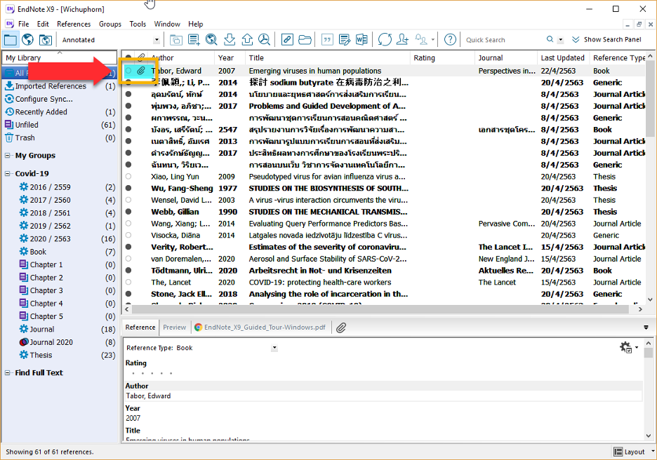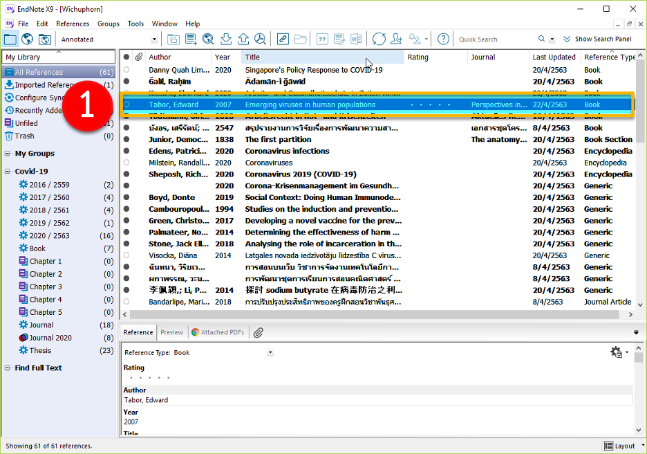 เมื่อทำการบันทึกรายการอ้างอิงดังกล่าวเรียบร้อยแล้วนั้น รายการอ้างอิงจะอยู่ใน EndNote Library ดังภาพด้านล่าง
