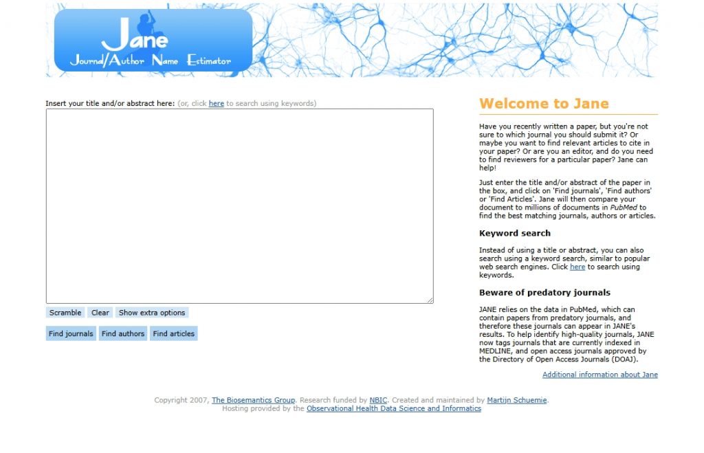 Journal / Author Name Estimator (JANE) เป็นเครื่องมือที่ช่วยผู้ใช้ในการค้นหาวารสารเพื่อตีพิมพ์บทความ โดยเชื่อมต่อโดยตรงกับฐานข้อมูล PubMed/MEDLINE มีรูปแบบการใช้งานที่ง่าย ผู้ใช้สามารถป้อนคำสำคัญ บทคัดย่อ หรือชื่อเรื่องของบทความเพื่อค้นหาวารสารที่เกี่ยวข้อง อย่างไรก็ตาม JANE ไม่มีฟังก์ชันเพิ่มเติมเหมือนกับ Springer Journal Selector หรือ Elsevier Journal Finder เช่น การระบุค่า Impact Factor ขั้นต่ำ หรือระยะเวลาในการตัดสินใจตอบรับบทความ ทั้งนี้ JANE จะแสดงข้อมูล Article Influence ซึ่งสะท้อนความถี่ที่บทความในวารสารนั้นถูกอ้างอิงในช่วง 5 ปีแรกหลังตีพิมพ์ เพื่อเป็นข้อมูลประกอบในการตัดสินใจเลือกวารสารของผู้ใช้