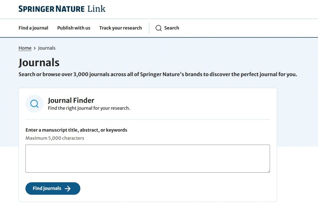Springer Nature Link เป็นเครื่องมือที่ช่วยผู้ใช้ในการค้นหาวารสารภายใต้สำนักพิมพ์ Springer Nature ซึ่งมีวารสารมากกว่า 3,000 รายชื่อสำหรับการตีพิมพ์บทความ โดยมีลักษณะการใช้งานคล้ายกับ Elsevier Journal Finder ผู้ใช้สามารถกรอกบทคัดย่อลงในระบบ จากนั้นระบบจะแสดง ค่า Impact Factor, 5-year Journal Impact Factor ระยะเวลาการตอบรับครั้งแรก และระดับความเกี่ยวข้องระหว่างวารสารกับบทความ รวมถึงรายละเอียดเบื้องต้นของวารสาร และเนื้อหาที่แต่ละวารสารให้ความสนใจ