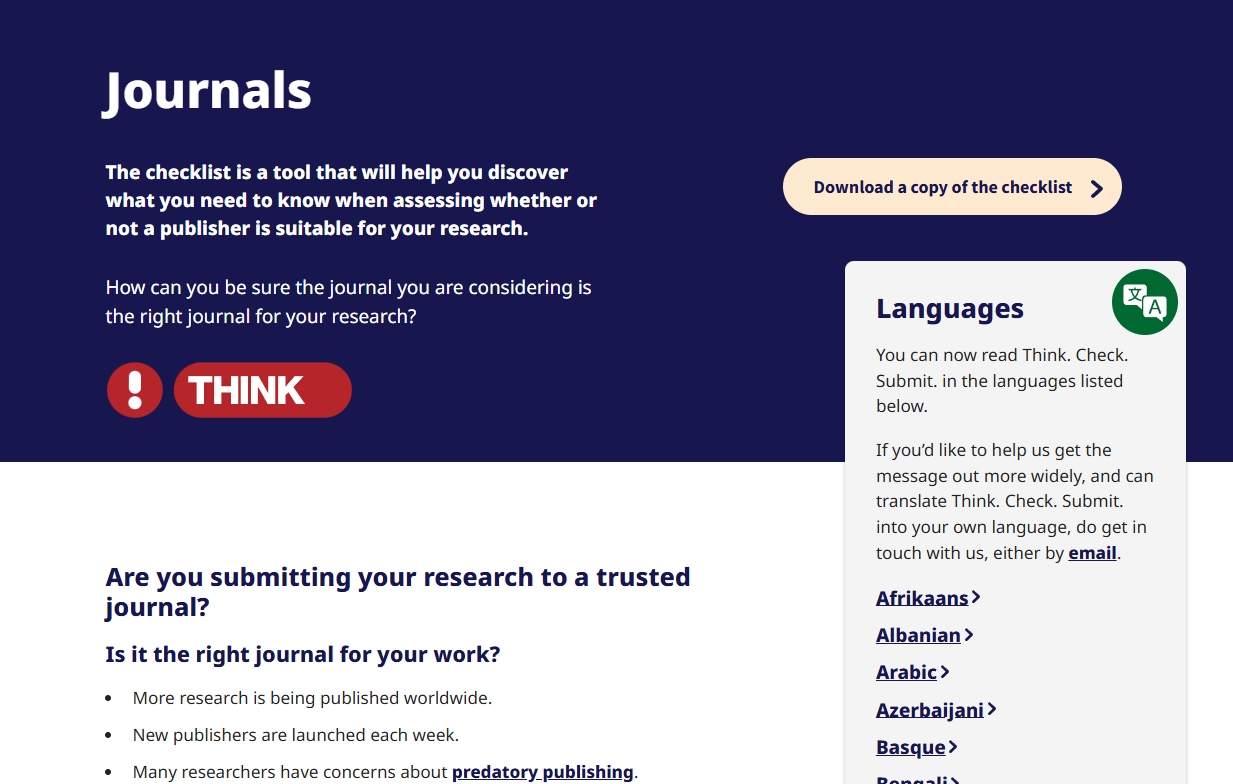 Think. Check. Submit เป็นแคมเปญที่ช่วยให้นักวิชาการ/นักวิจัยระบุวารสารที่มีความน่าเชื่อถือ โดยมีรายการตรวจสอบ (check list) อย่างง่าย แบ่งเป็น 3 หมวด คือ Think Check และ Submit ที่ผู้ใช้สามารถใช้เพื่อประเมินวารสารหรือสำนักพิมพ์ ความน่าสนใจของ Think. Check. Submit คือการให้ความรู้แก่นักวิชาการ/นักวิจัย การส่งเสริมการโปรโมทความซื่อสัตย์ และการสร้างความไว้วางใจในการวิจัยและสิ่งพิมพ์