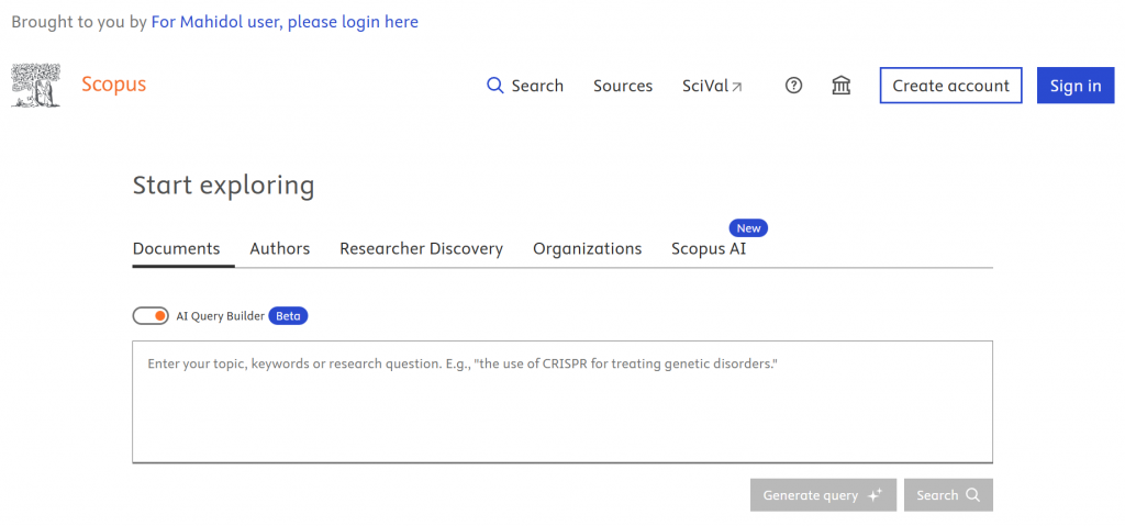 AI Query Builder เป็นฟีเจอร์ใหม่บนฐานข้อมูล Scopus ที่ออกแบบมาเพื่อช่วยผู้ใช้ในขั้นตอนสำคัญของการทำวิจัย คือ การตั้งคำค้น (search query) โดยระบบจะช่วยแปลงแนวคิดหรือคำถามวิจัยที่ผู้ใช้พิมพ์เป็นประโยคธรรมดา ให้กลายเป็นชุดคำค้นที่เหมาะสมสำหรับการสืบค้นบทความวิชาการ ผู้ใช้สามารถป้อนหัวข้อที่สนใจหรืออธิบายแนวคิดของงานวิจัยในรูปแบบภาษาทั่วไป จากนั้นระบบจะวิเคราะห์และสร้างคำค้นที่ประกอบด้วยคำสำคัญที่เกี่ยวข้อง คำพ้องหรือคำศัพท์เชิงวิชาการ รวมถึงโครงสร้าง query ที่เหมาะสมกับการค้นบทความในฐานข้อมูล