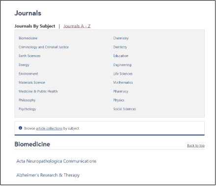 - ระบบจะแสดงรายชื่อวารสารทั้งหมดของฐานข้อมูล BioMed Central จากนั้นให้เราเลือกวารสารที่ต้องการตีพิมพ์