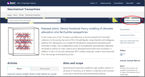 - เมื่อเข้าหน้าเพจวารสารแล้ว ให้เลือก “Submit manuscript”เพื่อยื่นตีพิมพ์ตีพิมพ์บทความ โดยหากผู้ใช้ยื่นตีพิมพ์ผ่านเครือข่ายอินเตอร์เน็ตมหาวิทยาลัย (MU LAN/WiFi) หรือผ่านลิงก์ที่ให้ไว้ข้างต้น (https://ejournal.mahidol.ac.th/login?url=https://www.biomedcentral.com/) ระบบจะลดค่าตีพิมพ์ 15% ให้แก่ผู้ยื่นตีพิมพ์โดยอัตโนมัติ