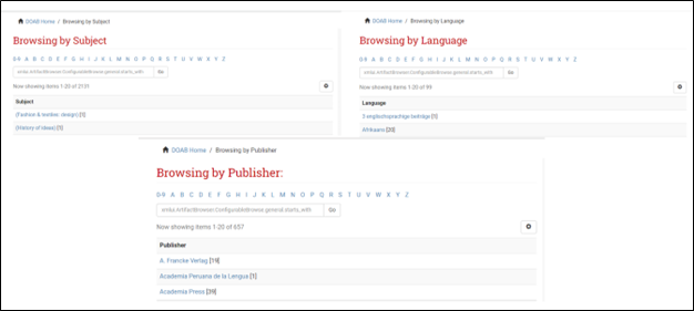 DOAB เป็นแหล่งข้อมูลที่รวบรวมทรัพยากรกว่า 80,000 รายการที่ผ่านการตรวจสอบโดยผู้เชี่ยวชาญจากสำนักพิมพ์กว่า 650 แห่ง (อาทิ Taylor & Francis, Springer Nature, Oxford University Press, Cambridge University Press, IOS Press) โดยมีหนังสือที่ให้บริการครอบคลุมสาขาวิชาวิทยาศาสตร์และเทคโนโลยี (เช่น วิทยาศาสตร์การเกษตร เกษตรกรรมและอุตสาหกรรม วิศวกรรมชีวเคมี วิศวกรรมชีวการแพทย์ เทคโนโลยีชีวภาพ ความหลากหลายทางชีวภาพ นาโนเทคโนโลยี คอมพิวเตอร์ อุตสาหกรรมพลังงาน เทคโนโลยีพลังงานและวิศวกรรม วัสดุศาสตร์ เทคโนโลยีโลหะ) และ มนุษยศาสตร์และสังคมศาสตร์ (เช่น กฎหมาย ภาษาศาสตร์ การบริหารจัดการ ศิลปะและสถาปัตยกรรม ประวัติศาสตร์และโบราณคดี)