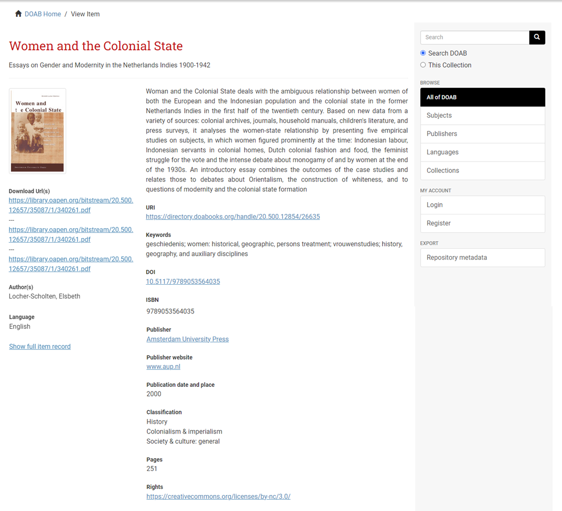 Directory of Open Access Books (DOAB) คือฐานข้อมูลที่รวบรวมหนังสือวิชาการแบบเปิด (Open Access) ที่เปิดให้ผู้สนใจสามารถ อ่าน ดาวน์โหลด และแชร์บทความได้ฟรี ภายใต้สัญญาอนุญาตแบบเปิดครีเอทีฟคอมมอนส์ (Creative Commons License: CC)