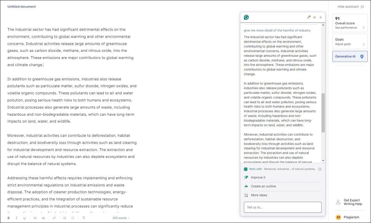 ตัวอย่าง หากผู้ใช้งานสนใจเนื้อหาบางประเด็นจากเนื้อหาที่ระบบร่างขึ้นมาให้ตามข้อ 1. อาจป้อนข้อความเพื่อให้ระบบขยายความประเด็นนั้น ๆ โดยในกรณีนี้อาจให้ขยายความเรื่องผลเสียของโรงงานอุตสาหกรรม โดยอาจป้อนในระบบว่า “give me more detail of the harmful of industry” จากนั้นจะได้เนื้อหาตามรูปภาพที่ 2