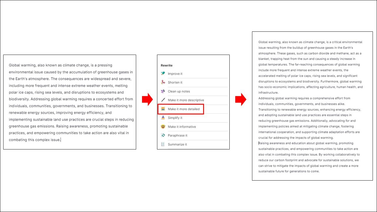 ตัวอย่าง หากผู้ใช้งานต้องการปรับข้อความให้ยาวขึ้น ให้เลือก “make it more detail” ดังภาพ จากนั้นระบบจะปรับข้อความออกมาดังภาพ 3