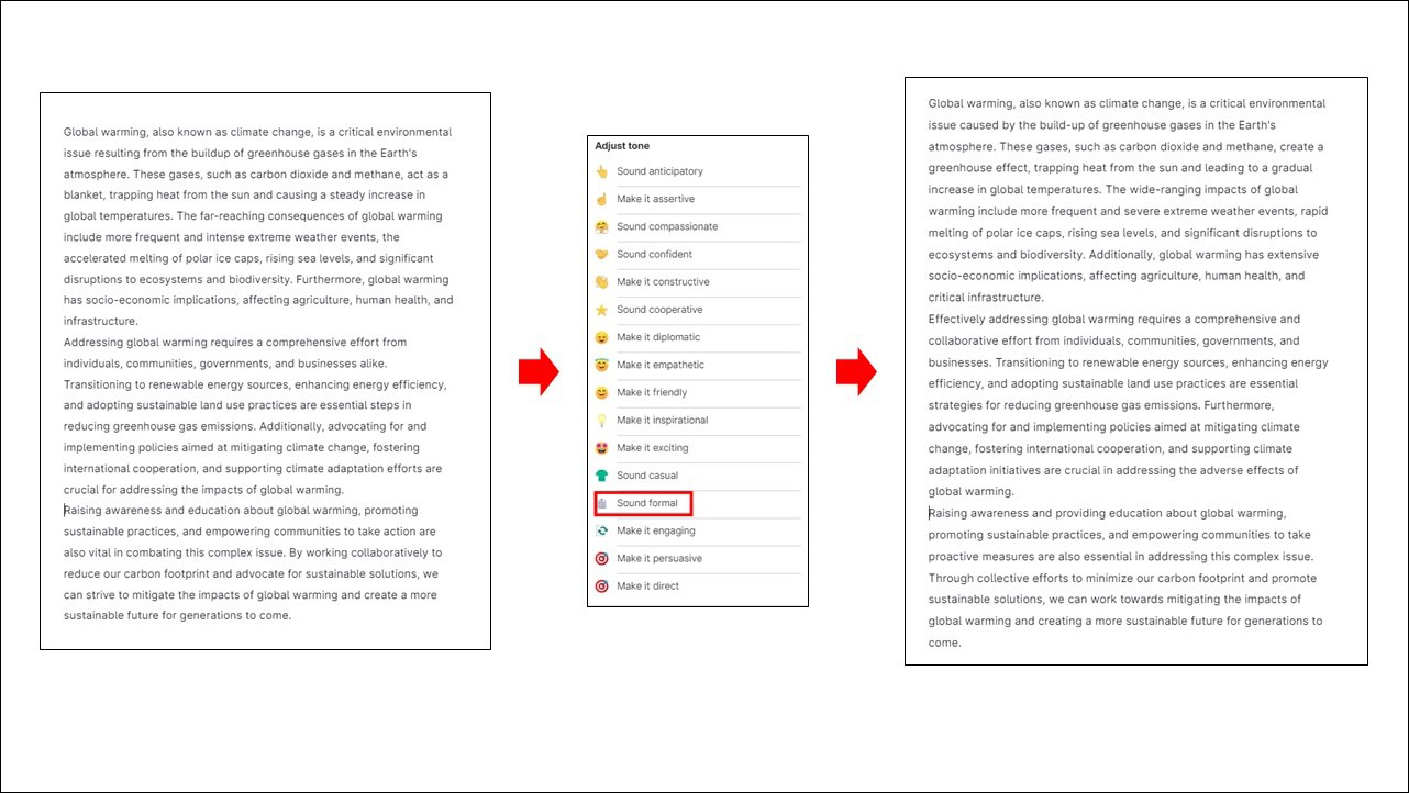 ตัวอย่าง หากผู้ใช้งานต้องการส่งเนื้อหานี้ให้กับ อาจารย์ หรือหัวหน้างาน ซึ่งอาจต้องการความเป็นทางการในภาษามากขึ้น ผู้ใช้งานสามารถเลือกตัวเลือก “sound formal” ในหัวข้อ “adjust tone” ได้ตามภาพที่ 4