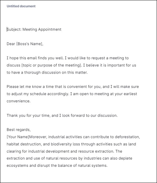 ตัวอย่าง ผู้ใช้ต้องการร่างอีเมลถึงหัวหน้าเรื่องการนัดหมายการประชุม โดยอาจพิมพ์คำสั่งว่า “write me email to my boss about meeting appointment” ระบบจะร่างข้อความในรูปแบบอีเมลได้ดังนี้