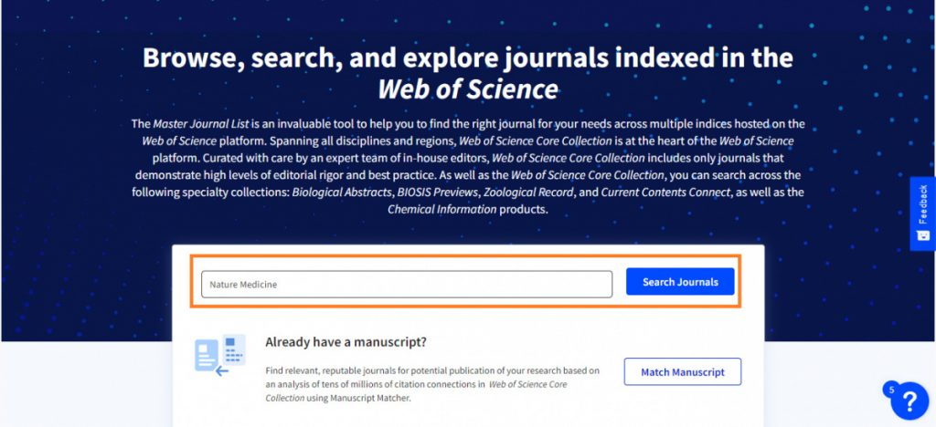 พิมพ์ชื่อวารสารที่ต้องการค้นหาค่า JCI เช่น Nature Medicine แล้วคลิกที่ปุ่ม Search Journals ดังภาพด้านล่าง