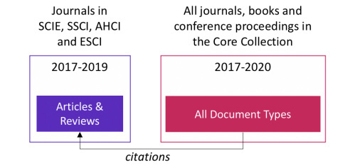 ยกตัวอย่างเช่น JCI 2020 จะคำนวณสำหรับวารสารที่ตีพิมพ์ผลงานที่อ้างอิงได้ [หมายความถึง บทความ (article) หรือ บทวิจารณ์ (review)] ขณะที่่ จดหมาย ข่าว และบทบรรณาธิการ จะไม่ถูกนำมาคำนวณ ใน Web of Science ในปี 2017, 2018 และ 2019 นับการอ้างอิงทั้งหมดที่ได้รับจากผลงานตีพิมพ์ที่จัดทำดัชนี ระหว่างปี 2017 ถึง 2020