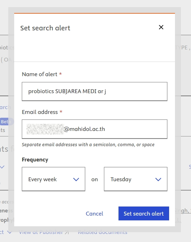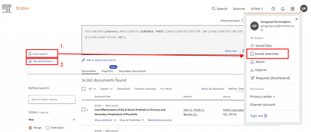หากต้องสืบค้นข้อมูลในหัวข้อเดิมซ้ำ ๆ การ ล็อกอิน และใช้ฟีเจอร์ Saved Search บน Scopus จะช่วยให้ผู้ใช้สามารถบันทึกเงื่อนไขการสืบค้นทั้งหมดได้อย่างครบถ้วน ทั้งคำค้น ตัวกรอง ปีที่เผยแพร่ หรือประเภทเอกสาร เพื่อเรียกใช้ซ้ำได้ทันทีโดยไม่ต้องตั้งค่าใหม่ทุกครั้ง ซึ่งช่วยประหยัดเวลาและลดความซ้ำซ้อนในการทำงาน โดยเฉพาะอย่างยิ่งสำหรับนักวิจัยที่ต้องติดตามข้อมูลในสาขาเฉพาะทางอย่างต่อเนื่อง นอกจากนี้ยังสามารถคลิก Set search alert เพื่อให้ระบบส่งอีเมลแจ้งเตือนอัตโนมัติเมื่อมีบทความใหม่ที่ตรงตามเงื่อนไขที่บันทึกไว้ถูกเพิ่มเข้าสู่ฐานข้อมูลฯ ทำให้ไม่พลาดงานวิจัยล่าสุดและสามารถติดตามความเคลื่อนไหวทางวิชาการได้อย่างต่อเนื่อง โดยผู้ใช้บริการสามารถตั้งค่าอีเมลที่ต้องการให้ระบบส่งข้อความ รวมถึงความถี่ในการแจ้งเตือนได้
