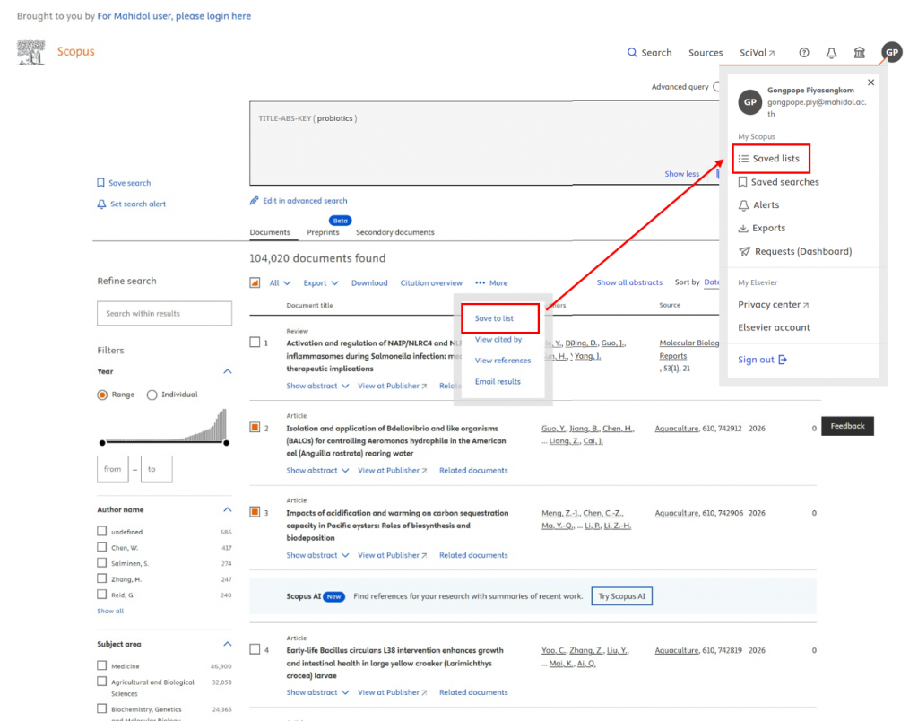 หลังจากบันทึกแล้ว ผู้ใช้สามารถเข้าถึงบทความที่เก็บไว้ทั้งหมดได้จากเมนู Saved lists ในโปรไฟล์ส่วนตัวของ Scopus ซึ่งสามารถเปิดอ่านบทความ ดาวน์โหลดข้อมูลบรรณานุกรม หรือลบรายการที่ไม่ต้องการได้ในภายหลัง ใน Saved list นี้ยังสามารถบันทึกได้ทั้งรายชื่อนักวิจัย และวารสาร จึงเหมาะอย่างยิ่งสำหรับนักวิจัยที่ต้องรวบรวมเอกสารประกอบการศึกษา หรือเตรียมการอ้างอิงสำหรับงานเขียนวิชาการในระยะยาว นักวิจัยหรือวารสารที่สนใจ ซึ่งจะช่วยลดความซ้ำซ้อนในการค้นหาและทำให้การจัดการข้อมูลเป็นระเบียบมากขึ้น
